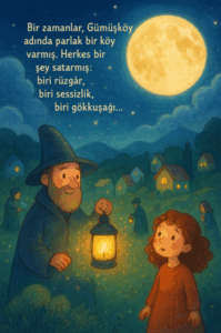 Bir zamanlar, bulutların arkasında saklanan Küçük Mavi Dağ’ın eteğinde, “Gümüşköy” adında minicik bir köy varmış. Bu köyde herkes bir şey satarmış: biri rüzgârı kavanozlara doldurur, biri gökkuşaklarını ipliğe dizer, biri de sessizlik satar — çünkü sessizlik bile orada değerliymiş.