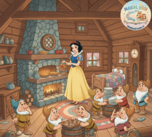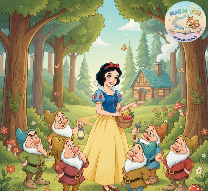 Akşam kulübeye madenci 7 cüce döndü: Neşeli, Somurtkan, Uykucu, Utangaç, Meraklı, Bilge ve Şaşkın. Pamuk Prenses’i görünce önce korktular ama prenses uyanıp hikâyesini anlatınca ona acıyıp yanlarında kalmasına izin verdiler. “Gündüz madende olacağız, sakın kapıyı kimseye açma!” dediler.