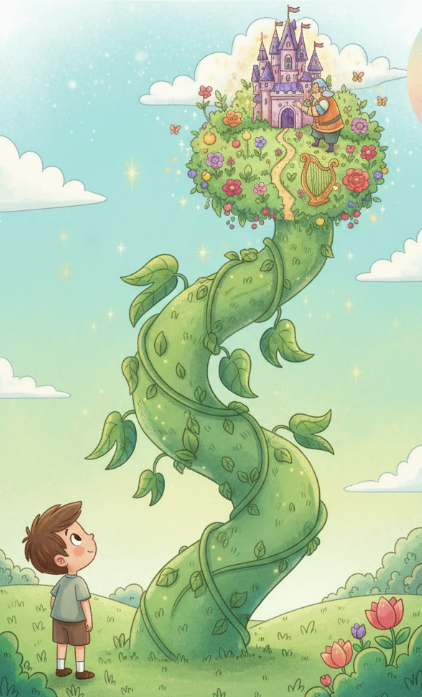 ” Çocuk ekti, sabah bir de baktı ki fasulyeler gökyüzüne uzanan dev bir sap olmuş! Merakına yenilen çocuk tırmanmaya başladı. Bulutların üstünde muhteşem bir bahçe vardı. Altın yumurtlayan tavuk ve kendi kendine şarkı söyleyen arp! Ama bahçenin sahibi dev uyuyordu: “Fi-fi-fo-fam, insan kokusu alıyorum!”